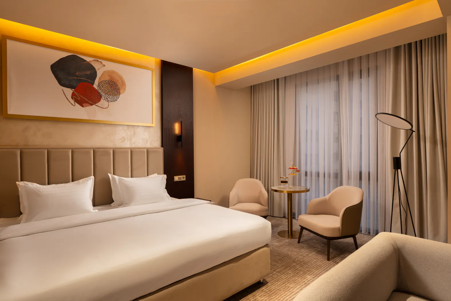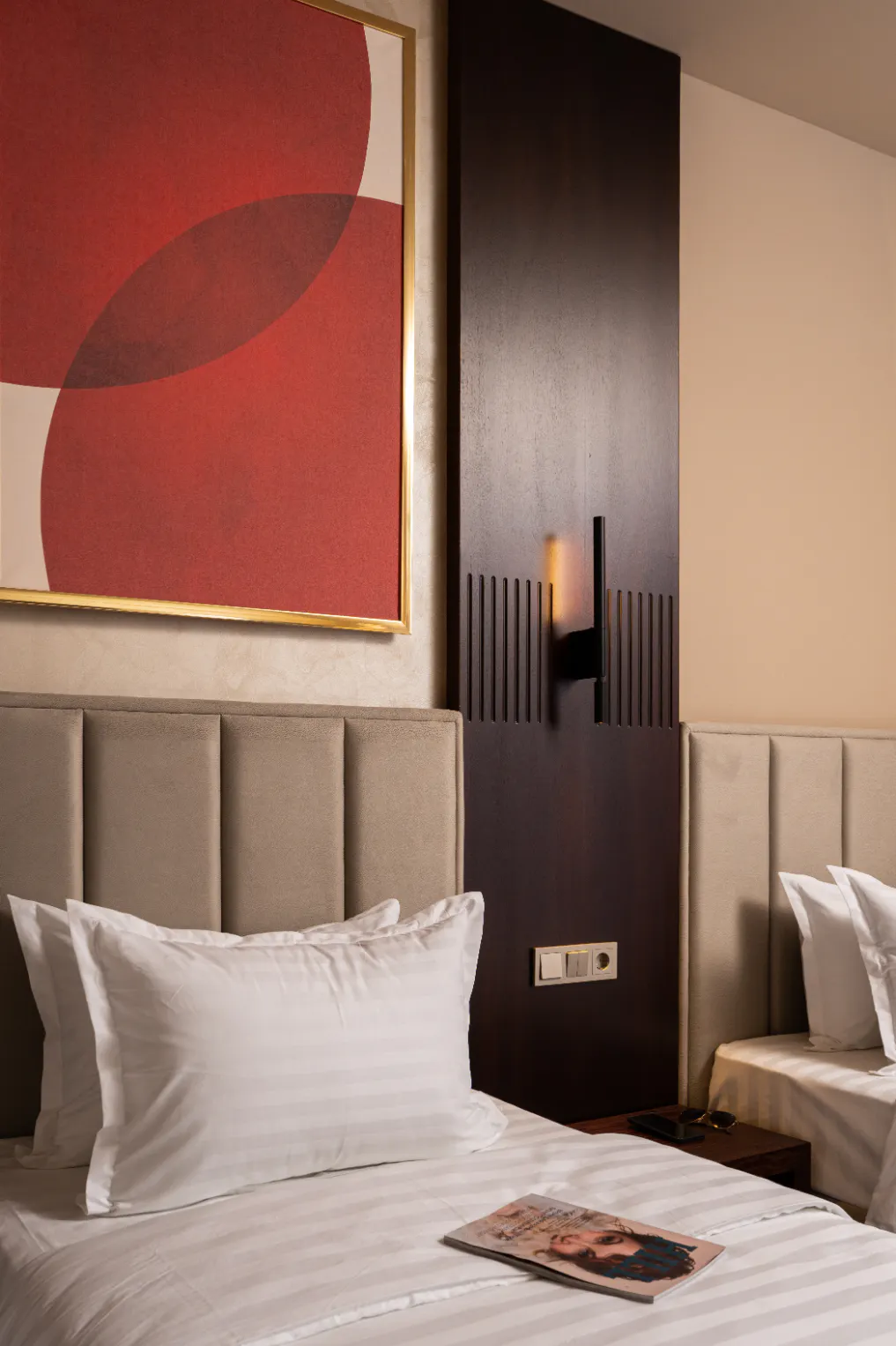 Adoptez l'élégance contemporaine dans notre chambre Supérieure, alliant modernité et confort exceptionnel. Profitez d'une vue sereine sur la campagne ou la cour intérieure, du Wi-Fi haut débit, d'une Smart TV et de la climatisation à réglage individuel. Chaque chambre dispose d'un canapé-lit, d'un minibar, d'un coffre-fort et d'une salle de bain privative avec produits de toilette haut de gamme et serviettes moelleuses. Vous bénéficierez également d'un service de ménage quotidien, d'une laverie et d'un accès à la piscine, le tout dans un environnement non-fumeur, avec service 24h/24, conçu pour une détente raffinée.